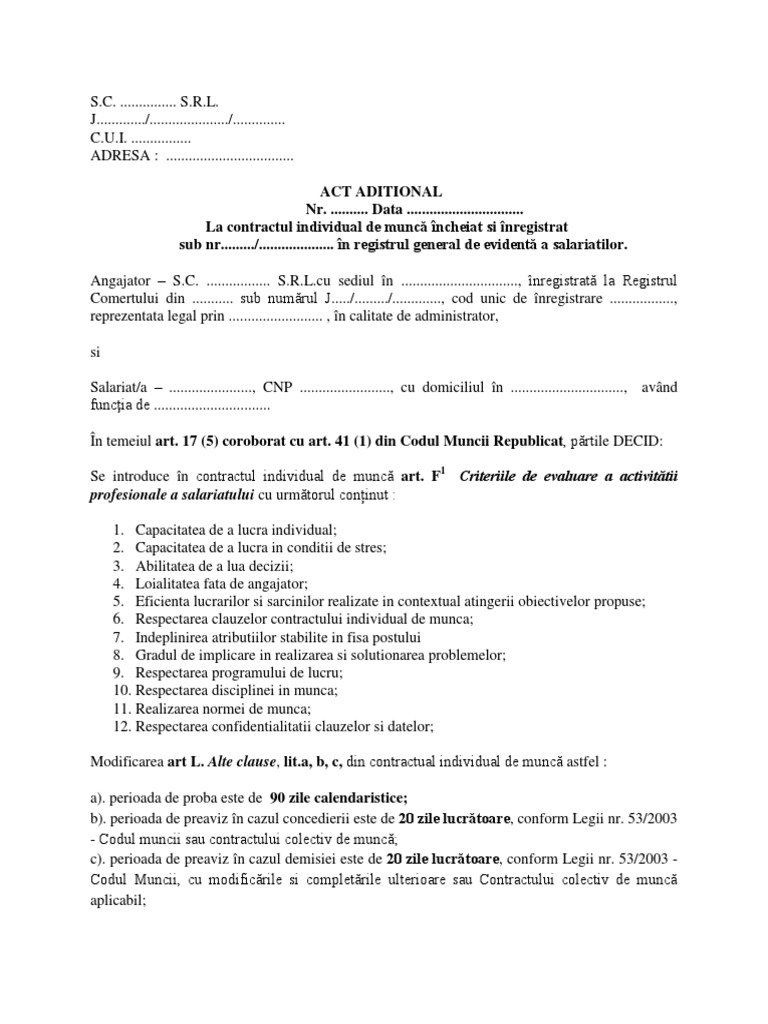 In raporturile de munca, un instrument important si util, in acelasi timp, atat pentru angajator, cat si pentru angajat, il reprezinta perioada de proba prin care sunt verificate aptitudinile profesionale si personale ale. 10 contractul individual de muncă este contractul în temeiul căruia o persoană fizică, denumită. Contract de munca » codul muncii.