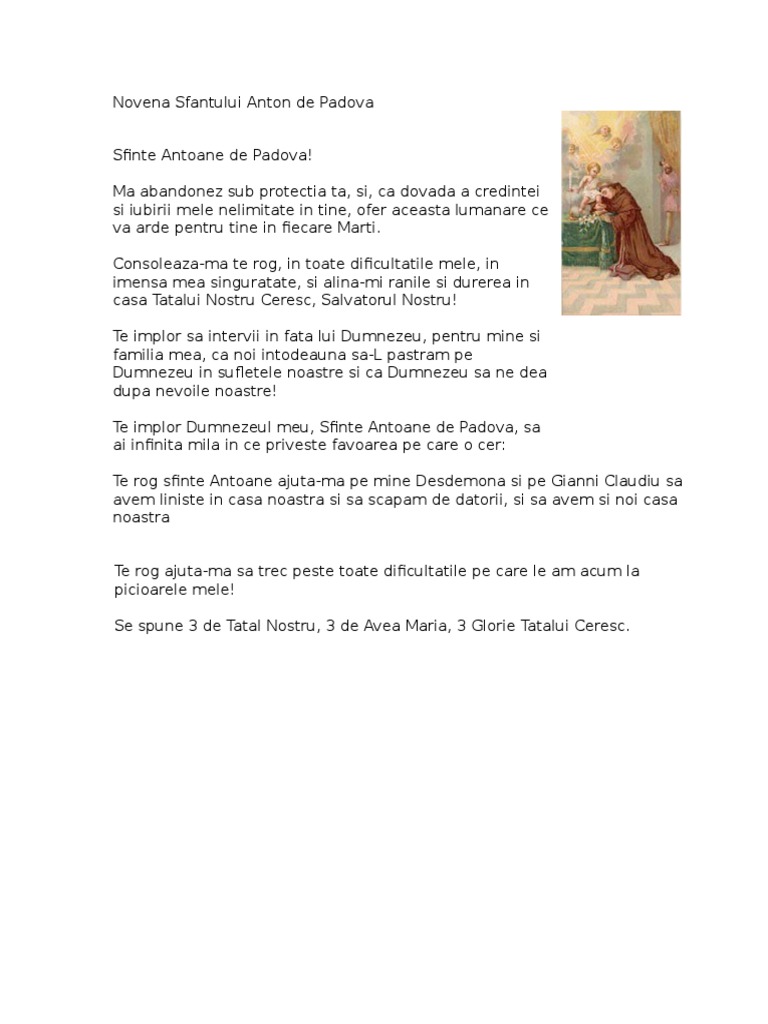 Rugaciune catre sfantul anton , rugaciune pentru a deveni mama , post negru , copiii , prunc , rugaciune noua marti la rand , copil. Sfinte ocrotitor anton, din suflet smerit te rugăm să ne alungi al vieții suspin, cu puterea harului divin! Doamne dumnezeule, tata ceresc, creator divin, tata si mama, si fiu deopotriva ,daca eu si familia mea, rudele mele, mosii si stramosii mei